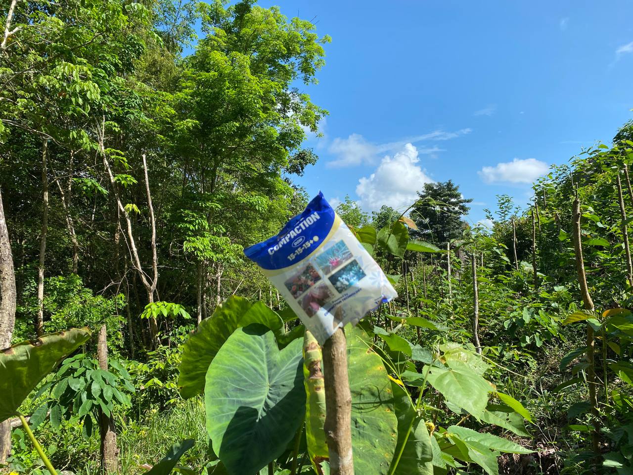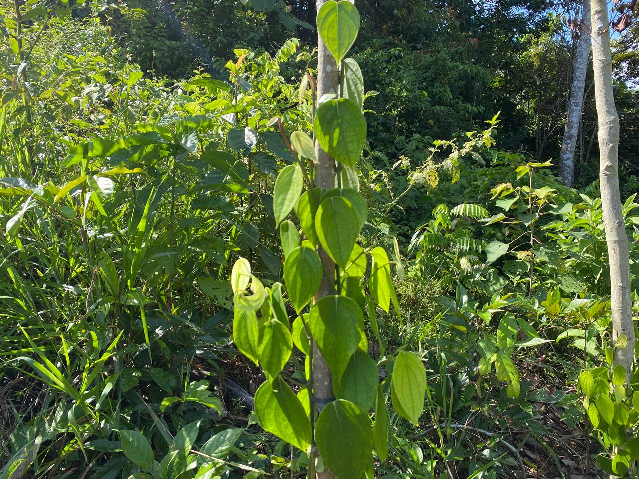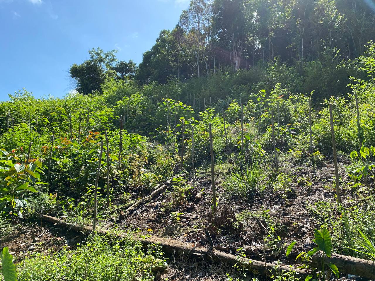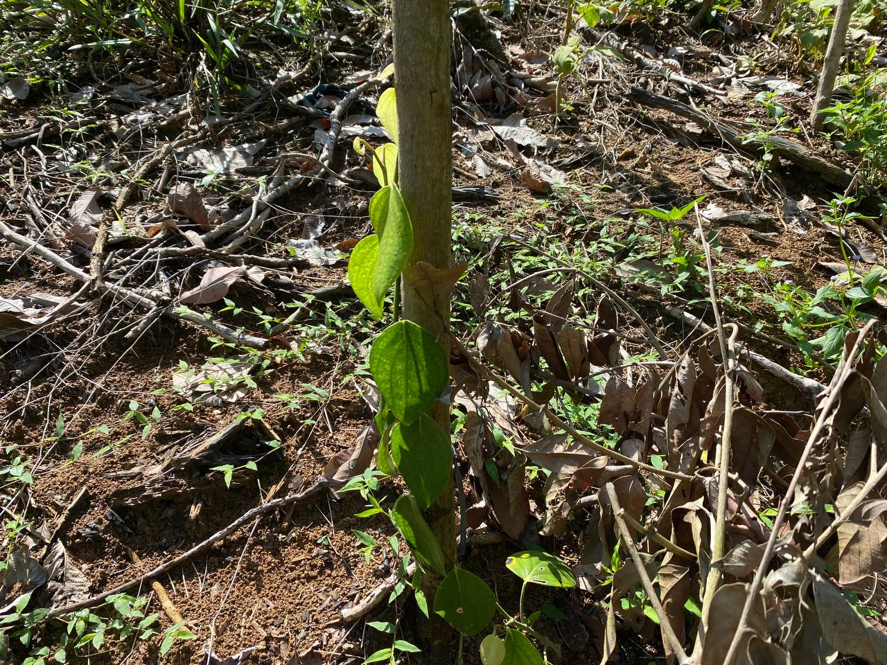 Monitoring kebun R1. Bibit lada sudah ditanam semua sekitar 350 batang dan bibit buah belum. Pertumbuhan tanaman sedikit terganggu karena terlalu semak dan belum dibersihkan kembali oleh petani (petani lama fokus di panen dan pasca panen). Umur lada baru 6 bulan menggunakan lahan baru. Sudah melakukan pemupukan 1x pasca tanam dengan NPK compaction 15-15-15. Baru menggunakan tajar mati sementara. Kondisi lahan miring dan bebatuan menyulitkan akses monitoring dan penanaman serta perawatan.