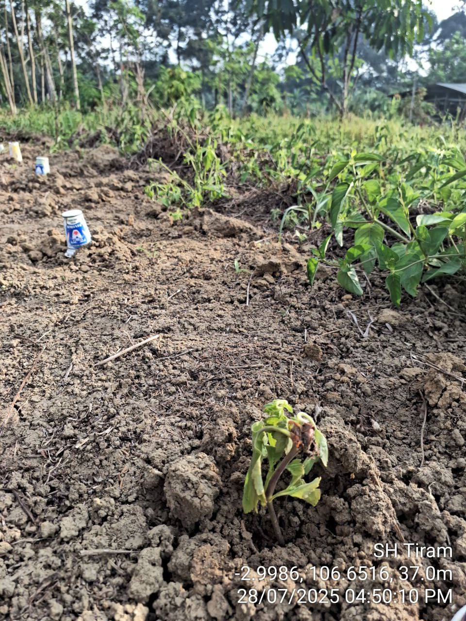 Usia 15 HST. Bibit Ditimbun Oleh Rumput Kering. Lumayan Bertahan Meskipun Pada Layu. Melihat Nilam Dewasa Di Lapang Seberangnya, Kondisi Kurang Air Karena Panas. Tapi Wanginya Semerbak. Lada Sudah Mulai Naik Junjung Meskipun Junjung Hidup Belum Bisa Mengimbangi (Akan Dipasang Tajar Sementara).