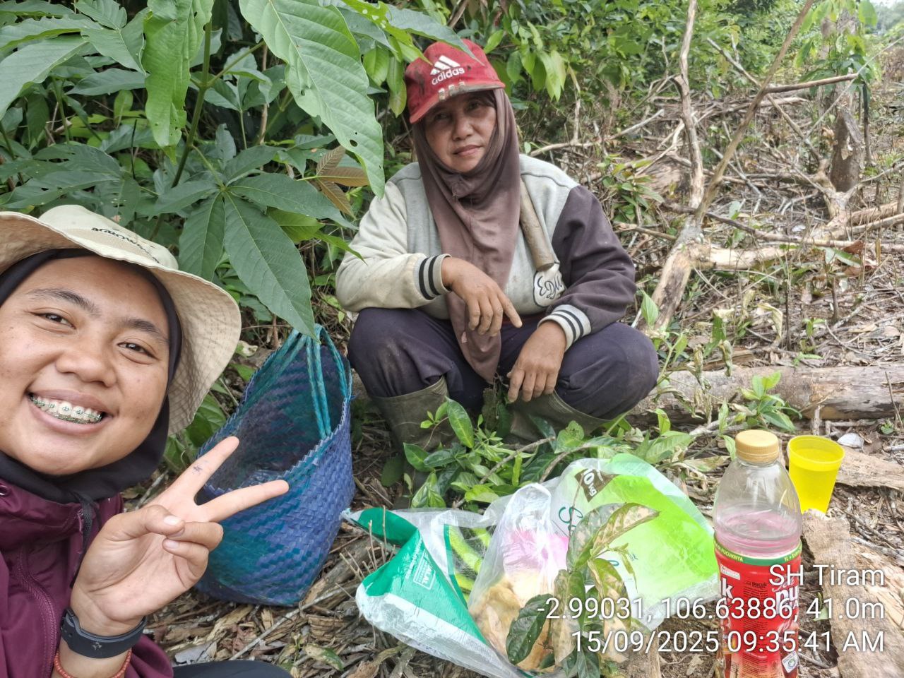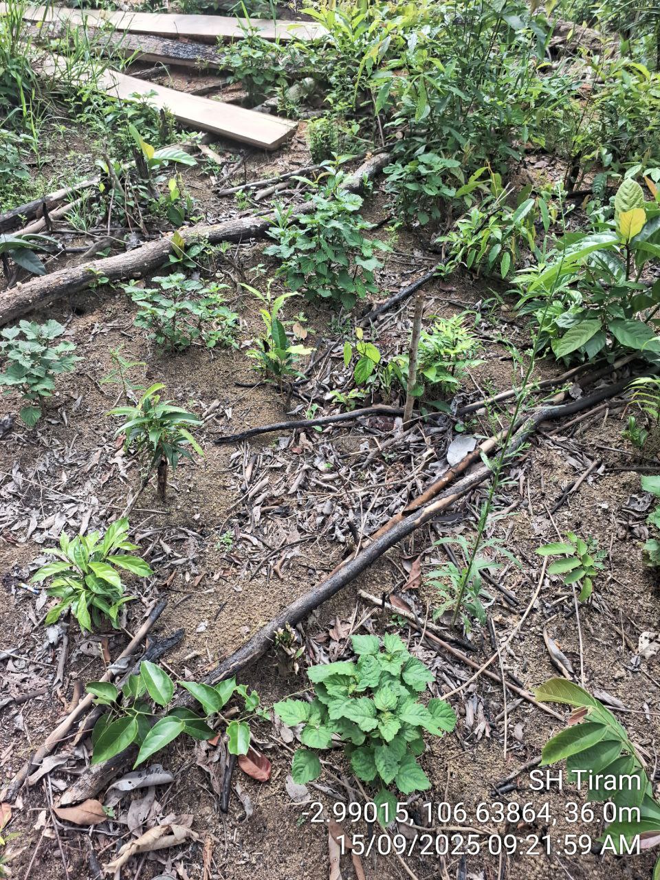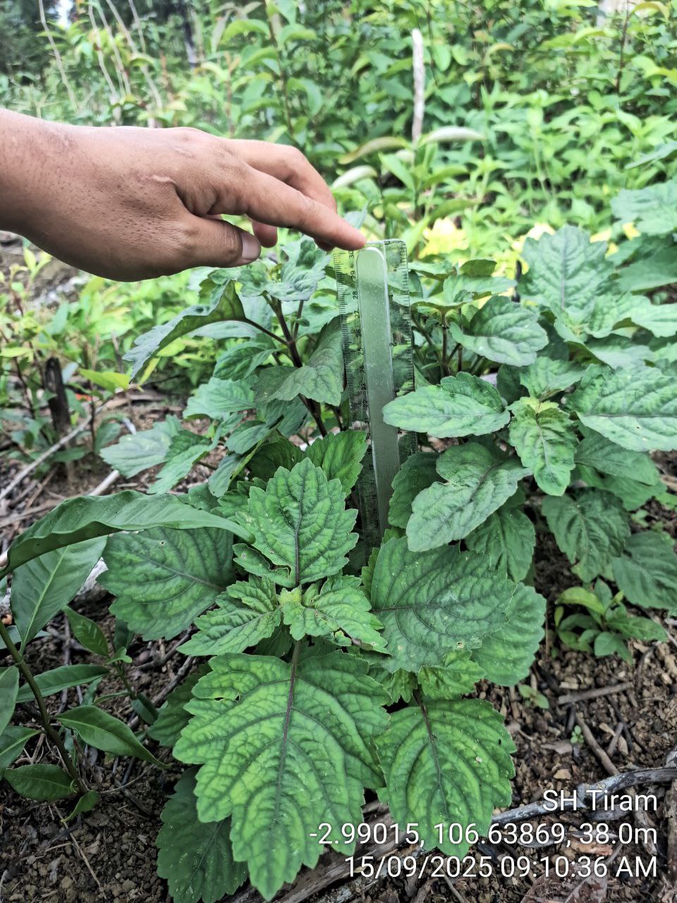 Pertumbuhan nilam bagus, banyak yang sudah rimbun sesuai antara pertumbuhan dan usianya. Diperkirakan pertumbuhan nilam yang bagus akibat pemberian pupuk ZA pada tanaman sawit dan NPK mutiara pada tanaman lada 2 minggu yang lalu, meskipun tidak spesifik pada nilam tapi nilam mendapat manfaatnya. Di lokasi lain yang nilamnya tidak berdekatan dengan lada dan sawit, pertumbuhan biasa saja seperti pada umumnya tanaman yang pulih dari cuaca panas. Ibunya sedang menanam lada untuk memenuhi lokasi agroforestri ini.